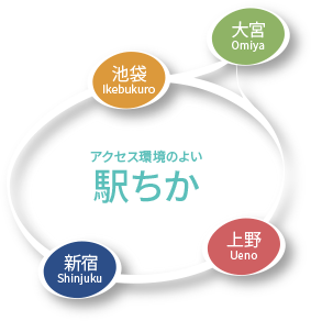 新宿本院だけでなく、池袋・大宮・上野など、ご自宅や職場近くの分院でも受診できます。全院駅ちかです。